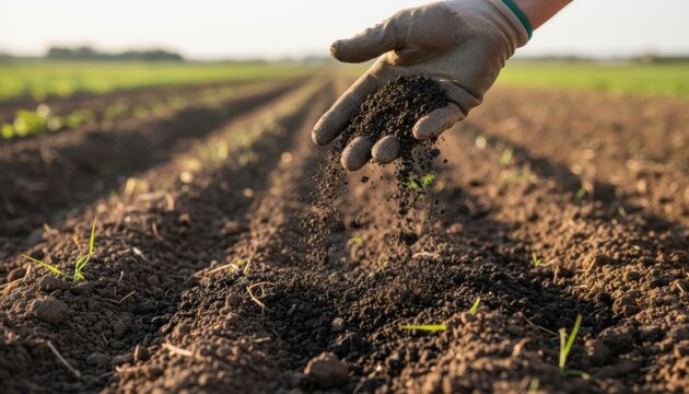 Closeup medium shot of a hand sprinkling biochar over farmland emphasizing carbon sequestration efforts.