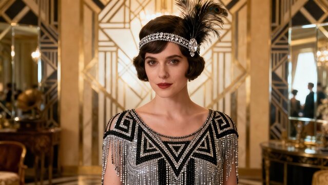 Elegant Flapper Girl in Vintage Dress with Feather Headband and Pearl Necklace
