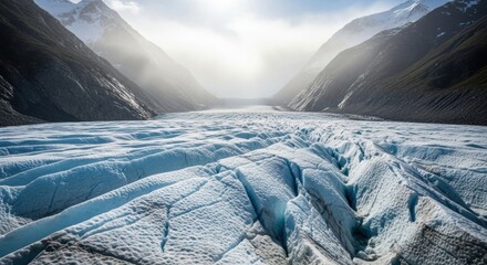 Majestic River of Ice: Sunlit Crevasses Carve a Path Through a Mountain Valley