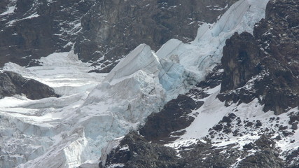Glacier le Bossons in the french Alps, Chamonix valley, Montblanc. The glacier crevasse and huge serac with blue ice on slopes of Mont Blanc. Melting glacier caused by climate change global warming