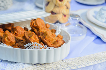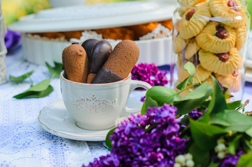 Outdoors there is a table decorated with purple tablecloths and flowers to Seregno. On the table, dishes in the style of Provence and a variety of sweets