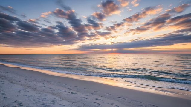 Peaceful coastal sunset on serene beach with sunny sky