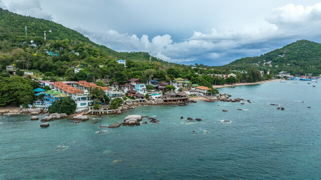 High angle view, beachfront accommodation on Koh Tao, Chumphon Province, Thailand.