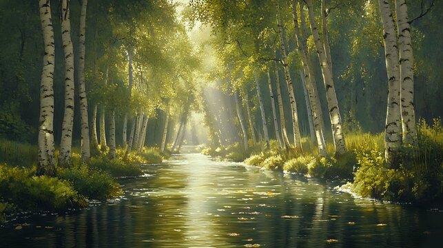 Tranquil river flowing through verdant forest in summer light