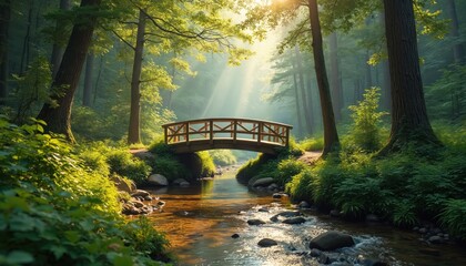 A rustic wooden bridge arches over a clear forest stream, surrounded by lush green trees and vibrant foliage. Sunlight streams through the canopy, illuminating the tranquil, natural scene.