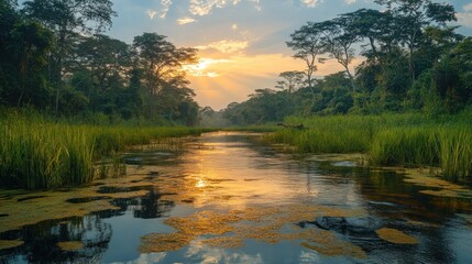 Golden sunlight illuminates a tranquil river surrounded by lush green vegetation and dense trees