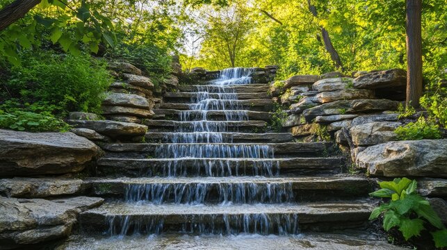 Peaceful cascading waterfall flowing over stone steps surrounded by lush greenery in a tranquil natural setting.