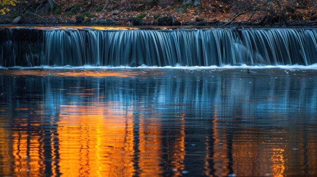 Serene waterfall cascading over rocks, reflecting autumn colors in tranquil river setting