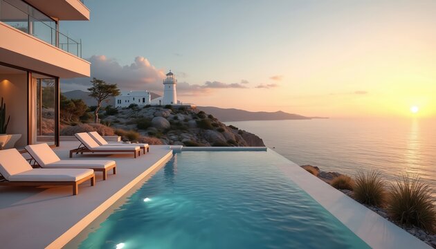 Coastal villa with infinity pool overlooking ocean at sunset. Luxurious modern architecture features a minimalist design. Lighthouse on the cliffside enhances the stunning ocean view.