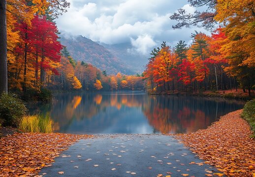 Serene autumn landscape featuring vibrant foliage reflecting on a tranquil lake under cloudy skies