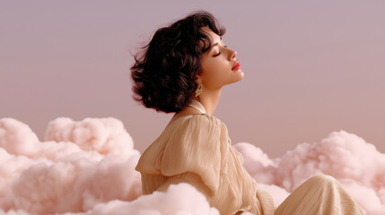 Stunning portrait of a confident woman against a dreamy pink cloudscape backdrop, perfect for beauty campaigns, wellness brands, or ethereal fantasy projects