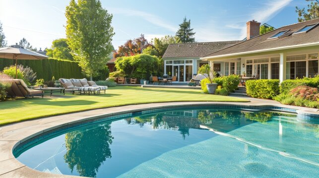 Elegant Large House Surrounded by Lush Greenery Featuring a Sparkling Pool in the Center of the Yard Creating a Relaxing and Inviting Outdoor Space for Family Gatherings and Leisure Activities