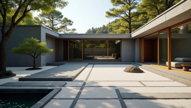 Serene Modern Garden With Sparkling Pool Surrounded By Greenery Images