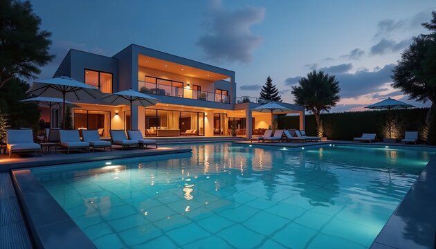 Modern Architectural House Surrounded by Lush Greenery Featuring a Sparkling Swimming Pool Illuminated at Night Creating a Tranquil and Inviting Outdoor Living Space for Relaxation