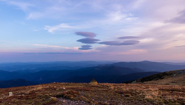 Breathtaking panoramic vista of majestic mountain ranges under a sky painted with unique cloud formations during a serene twilight moment, capturing the vastness of nature from a high alpine peak
