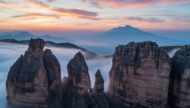 Dramatic jagged rock formations and spires rising above a sea of clouds during a beautiful, colorful sunrise with distant mountains on the horizon, an epic aerial landscape