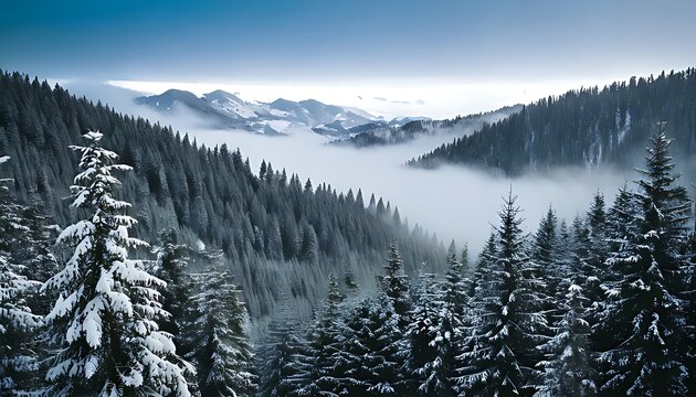 Expansive winter landscape view from above, showing vast snow-covered evergreen forests on mountain slopes with a tranquil mist filling the valleys below, under a soft, cloudy sky