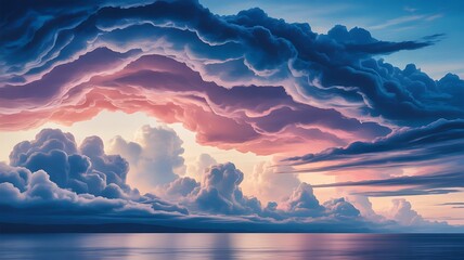 Dramatic sunset sky with pink and blue clouds over a calm ocean sunrise twilight