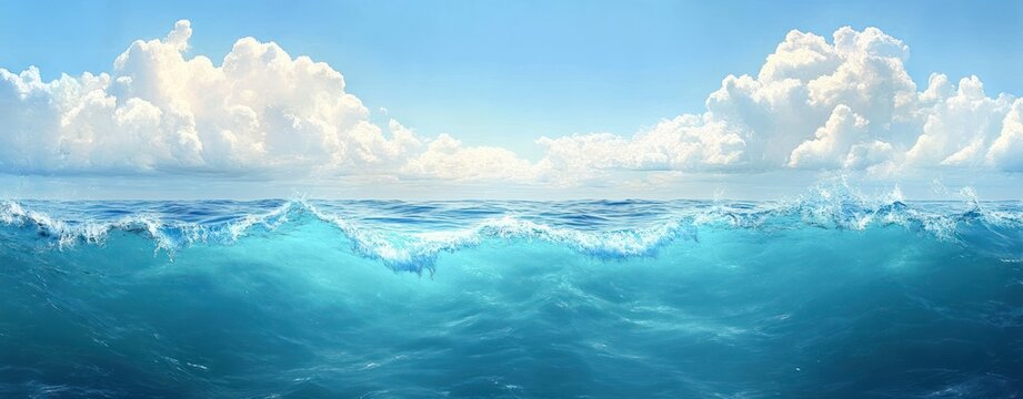turquoise ocean with rolling cresting waves and white foam under a bright blue sky dotted with fluffy cumulus clouds, serene and refreshing seascape