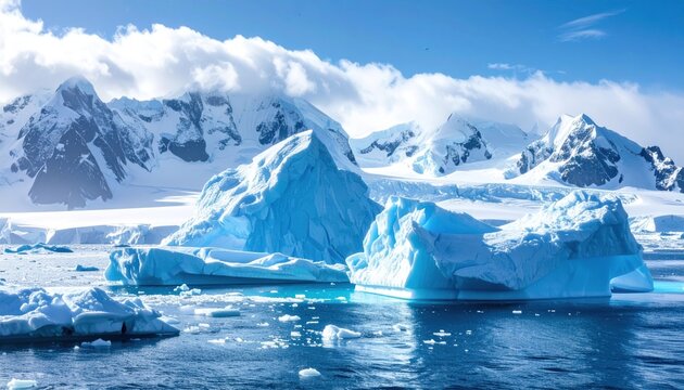 Scenic polar view of icebergs floating on water with snow-covered mountains under a blue sky dotted with clouds