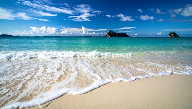 A serene coastal scene unfolds with clear turquoise water meeting a sandy shore under a bright blue sky with puffy clouds. Distant islands dot the horizon