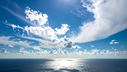 A serene vista presents a vast blue ocean under a brilliant azure sky dotted with fluffy, white clouds. Sunlight reflects across the water