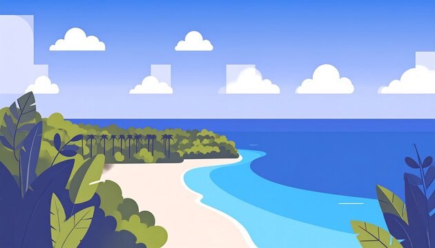 A stylized tropical beach scene with lush foliage, a sandy shore, and blue ocean under a sky dotted with clouds