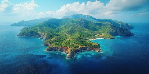 Aerial view of a lush, green island surrounded by vibrant blue ocean waters and dramatic cloud formations under a clear sky, highlighting natural beauty
