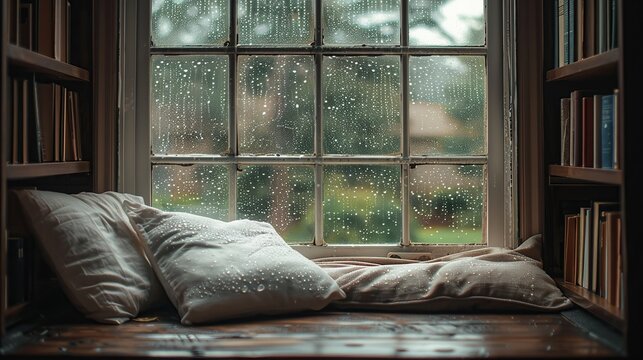 Cozy morning by the window with a cup of warm coffee, a soft blanket, and an open book on a rainy day