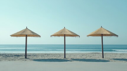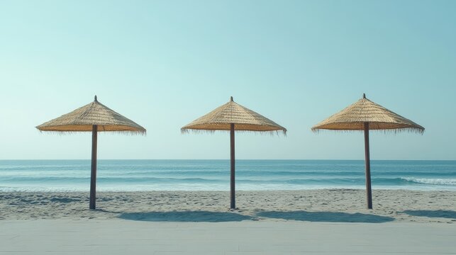 Straw umbrellas aligned on a sandy beach offering shade against a tranquil sea and clear blue sky, creating a serene coastal atmosphere.