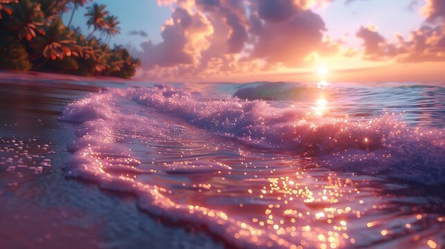 Tropical Paradise: A serene and picturesque tropical beach at sunrise, with gentle waves caressing the shore and palm trees swaying in the warm breeze.