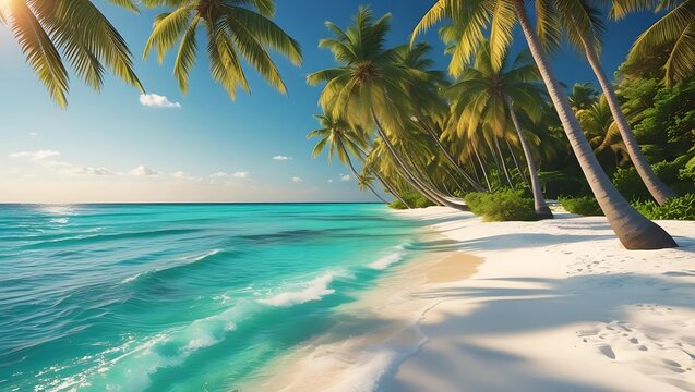 Tropical beach landscape with swaying palm trees bathed in warm sunlight under a bright blue sky, serene coastal scenery with soft golden light and calm tropical vibes