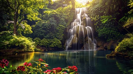 Serene tropical waterfall cascading into a turquoise pool, surrounded by vibrant flowers and lush greenery in a peaceful forest setting.