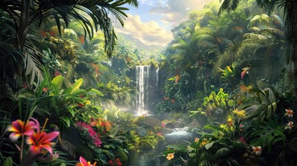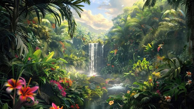 A serene jungle scene with a vibrant waterfall surrounded by lush greenery and colorful flowers, perfect for nature lovers.