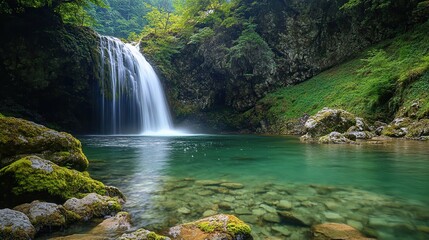 A serene waterfall cascades into a clear turquoise pool surrounded by lush greenery and mossy rocks in a tranquil forest setting.