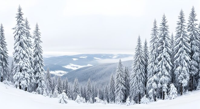 Snowy winter forest landscape. Coniferous trees covered in fresh snow. Tranquil scene with serene atmosphere. Frozen beauty of cold winter day. Peaceful, idyllic scene. Nature winter wonderland.