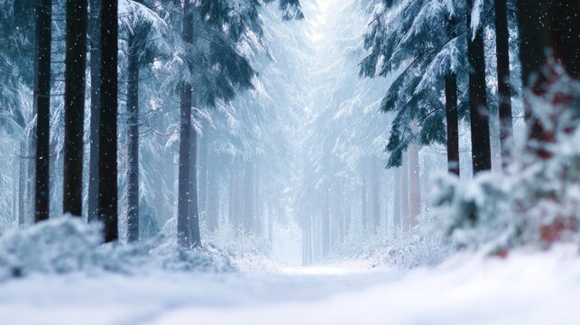 Snow covered forest path under soft snowfall, serene winter landscape with frosted trees