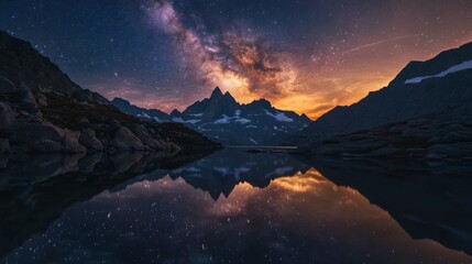 Majestic mountain range reflecting in a tranquil alpine lake at sunset