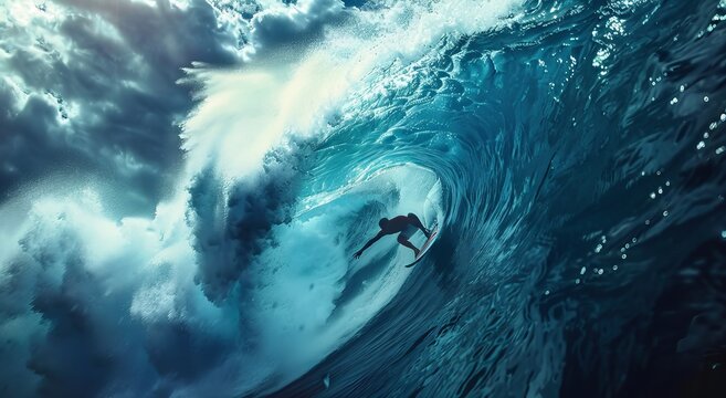Surfer on wave. Surfing man on board in tsunami. Extreme sport and travel. Blue tropical ocean or sea splash. Surfboarding relax. Surfboard in water storm