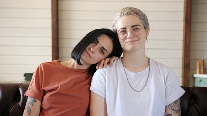 Serious lesbian couple with tattoos poses for camera