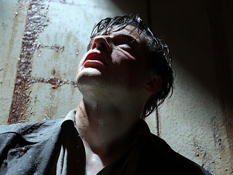 Close-up portrait of a thoughtful young man with dramatic lighting and shadows