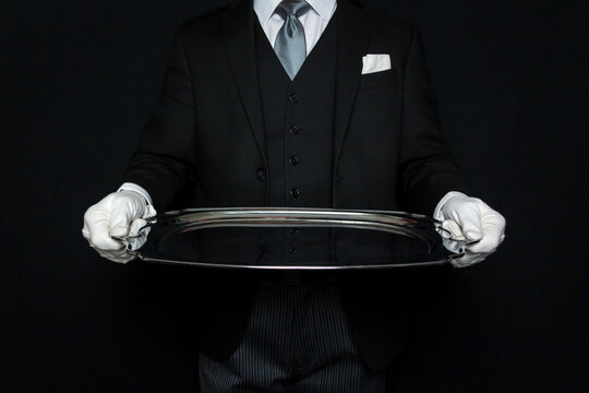 Portrait of Elegant Butler in Dark Suit and White Gloves Holding Large Silver Serving Tray. Service Industry and Professional Hospitality.