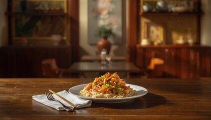 Chinese shrimp fried rice served on a plate, highlighting seafood and rice preparation