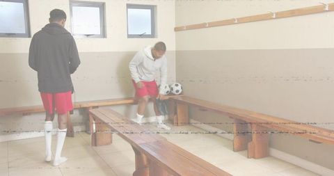 Soccer players preparing in locker room wearing red shorts and training gear