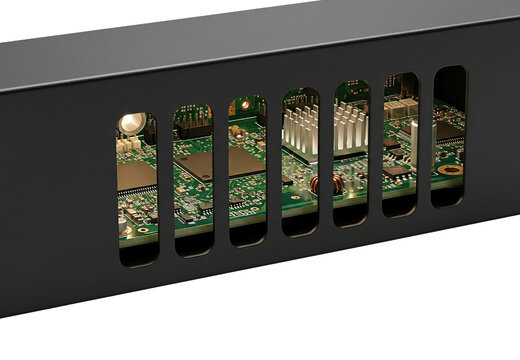 An edge computing microserver with glowing status LEDs sits on a factory workbench, shallow focus blurring the gritty industrial background.