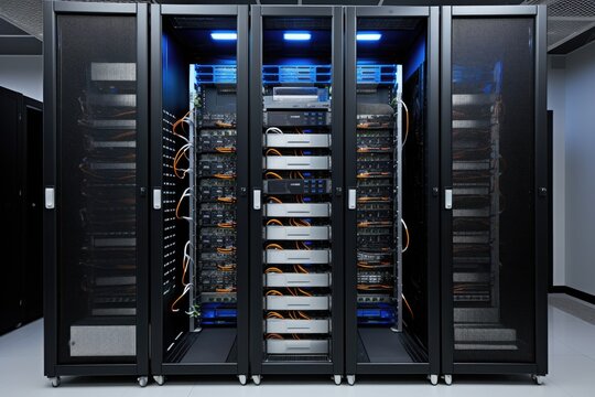 Futuristic data center corridor showing symmetrical server racks with blue and green leds