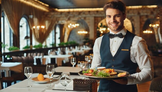 a handsome young smiling server waiter in restaurant with plates with food on a tray in a expensive luxury restaurant bringing food to a table in his hands
