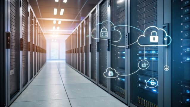 A modern data center hallway with server racks and cloud security icons representing secure cloud data storage and protection.
