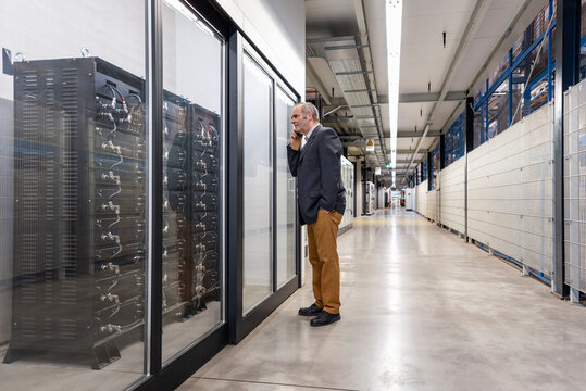 Futuristic Concept: Data Center Chief Technology Officer Holding Laptop, Standing In Warehouse, Information Digitalization Lines Streaming Through Servers. SAAS, Cloud Computing, Web Service