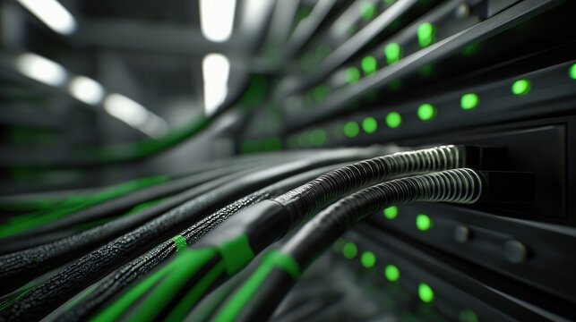 Green leds illuminate data center server rack with intricate cables